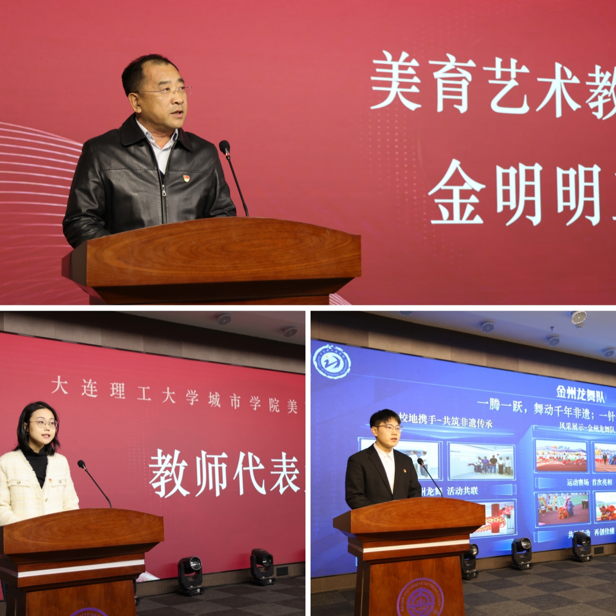 教师代表鹿瑞麟分享了“文化+艺术+科技”的教学探索,从AI技术重构动漫艺术课堂到数字资源打造跨时空教学场景;学生代表计算机工程学院黄家汇讲述了工科生跨界逐美的成长故事,从参与金州龙舞队传承非遗,到运用AIGC技术让非遗作品“破圈”传播。