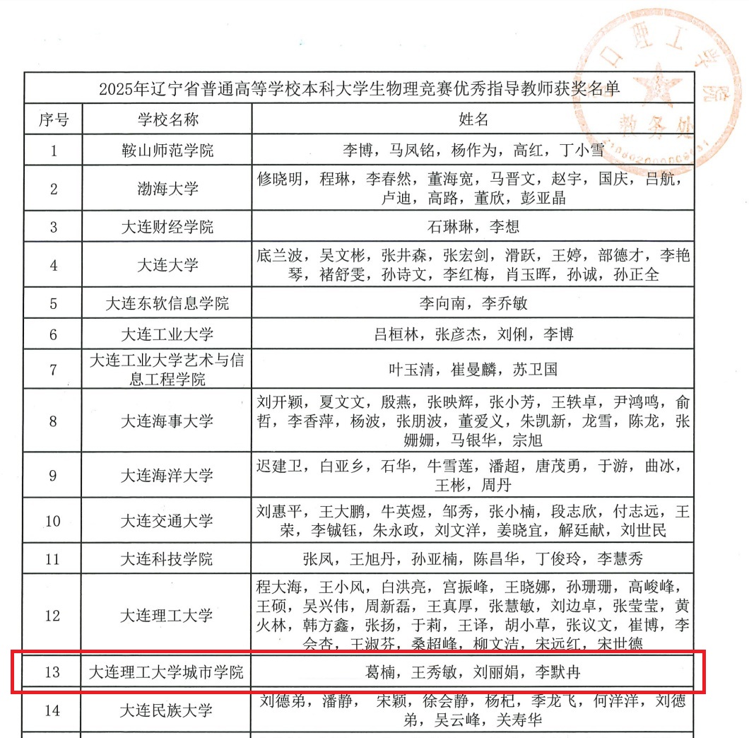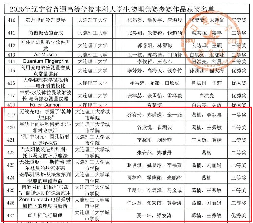 本网讯 9月25日,在2025年辽宁省普通高等学校本科大学生物理竞赛中,我院首次组队参赛便取得骄人战绩,推荐至省赛的9项作品全部获奖,实现了参赛项目的“满堂红”。