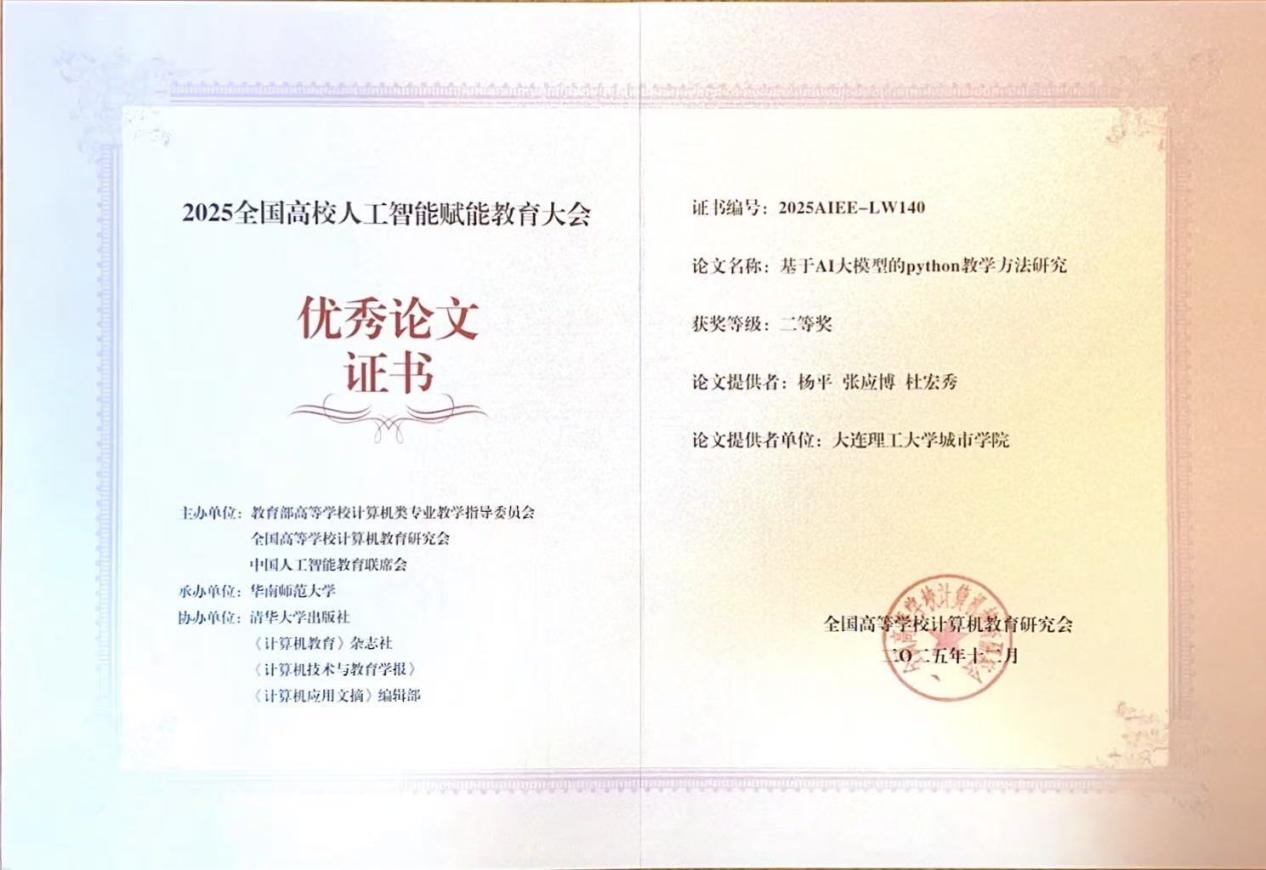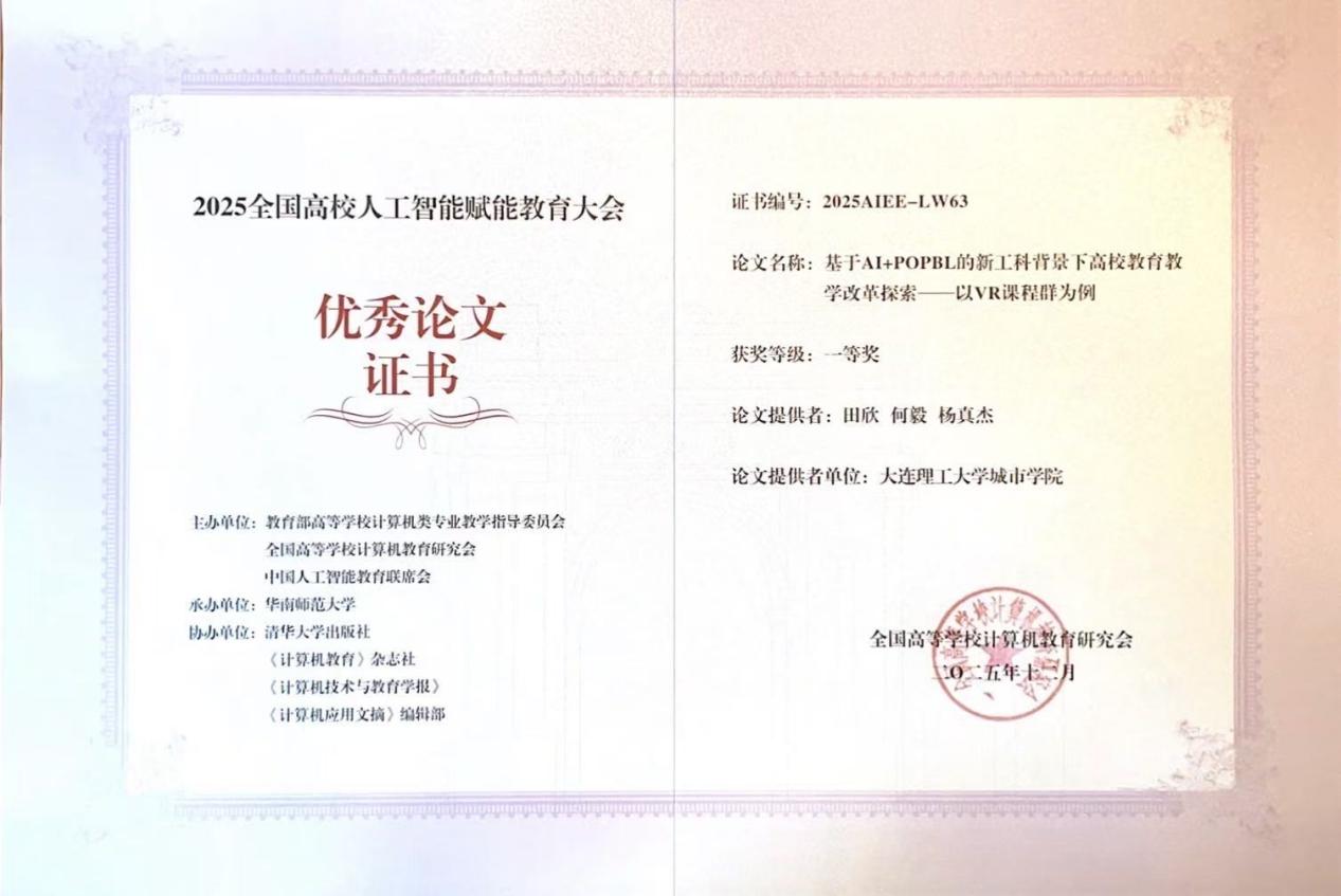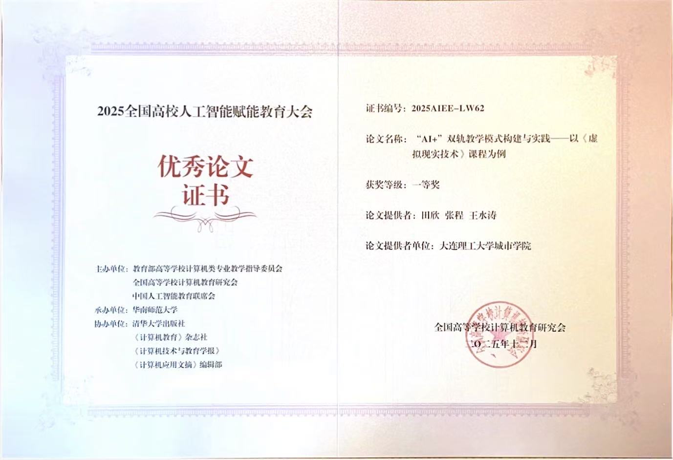 大会设有论文征稿环节,在近千篇参评论文中,我院计算机工程学院教师田欣、张程、王水涛的《“AI+”双轨教学模式构建与实践--以虚拟现实技术课程为例》以及田欣、何毅、杨真杰的《基于AI+POPBL的新工科背景下高校教育教学改革探索--以VR课程群为例》,凭借深入的实践探索、系统化的教学改革框架获评优秀论文一等奖;杨平、张应博、杜宏秀的《基于AI大模型的python教学方法研究》,将人工智能深度融入教学全过程,成效显著,获评优秀论文二等奖。这一成绩不仅展示了我院在该领域的丰硕研究成果,也体现了我院青年教师在学术创新和教学应用方面的突出能力。