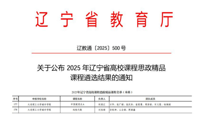 本网讯 12月29日,辽宁省教育厅发布2025年度辽宁省高校课程思政精品课程遴选结果。我院《中国建筑史A》与《线性代数》成功入选省级思政精品课程名单。