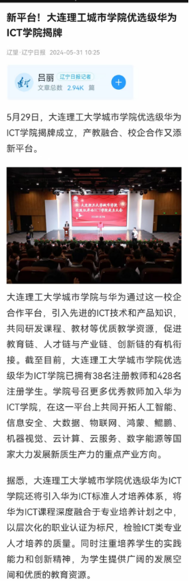 辽望·辽宁日报:新闻平台!大连理工大学城市学院优选级华为ICT学院揭牌